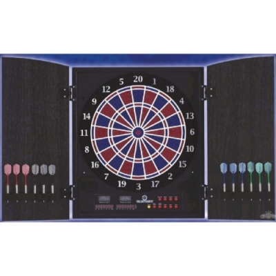 Edelversion im Holzschrank - Für 1-8 Spieler - Automatischer Punktebewertung - 19 Spiele mit 119 Varianten - Inkl. 12 Softdarts, 50 Ersatz-Soft-Tips, Netzgerät 230 V